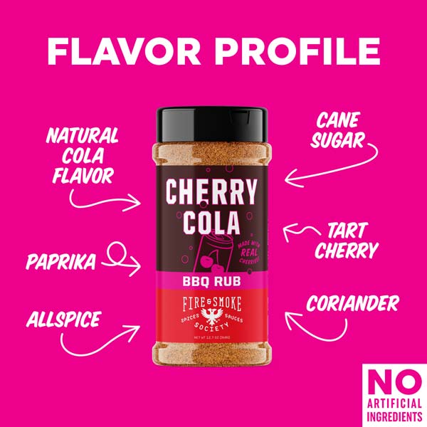 The perfect blend of tart cherry powder, cane sugar, paprika, coriander, allspice, and natural cola flavor. With a distinct soda pop sweetness, a hit of cherry, and whiff of savory spices, our distinct and irresistible blend will steal the show at any cookout.