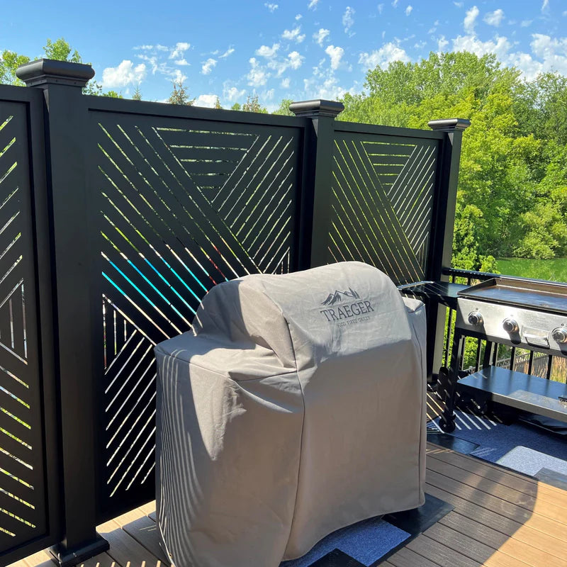 • Our privacy wall will turn your outdoor space into a modern haven. The screens timeless design can be used in a variety of applications from creating wind walls, deck privacy screens, barbecue or equipment enclosures and even simply to highlight an outdoor kitchen. These laser cut panels are sure to wow in any backyard space.