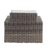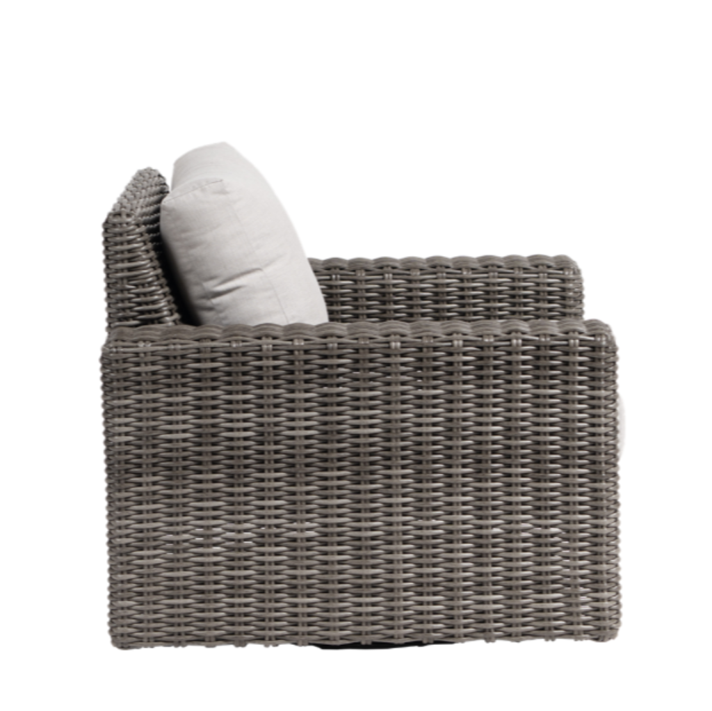 DESIGN - The Mission Hill collection from Ratana features woven resin (HDPE) in a Pewter finish, wrapped tightly over powder-coated aluminum frame in the color Nimbus Star. This collection also has the option to choose your own cushion fabric from the selection provided. Swatches of the fabrics are available to view in store.